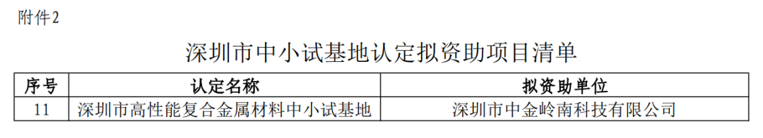 近日,深圳市科技创新局发布《深圳市科技创新局关于深圳市概念验证中心和中小试基地拟认定、评估资助项目的公示》,中金岭南所属中金科技(以下简称“中金科技”)成功入选,被认定为“深圳市高性能复合金属材料中小试基地”。