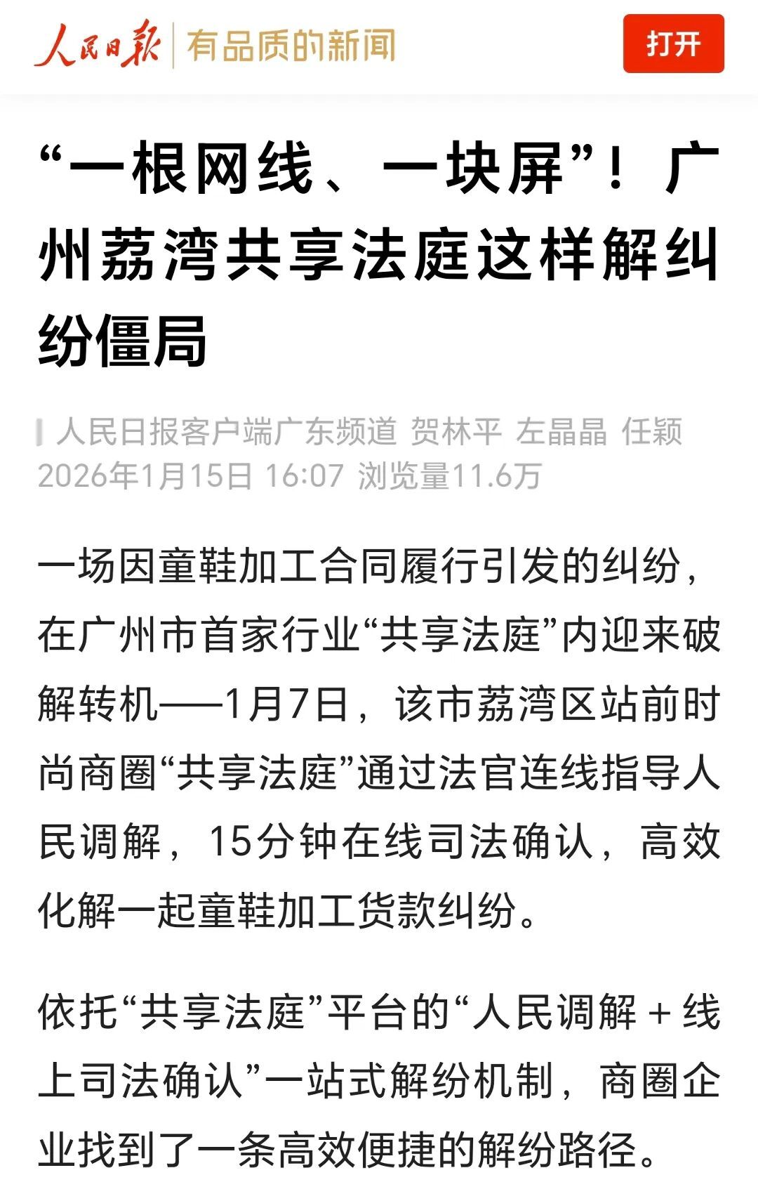 突破司法服务时空限制,率先落地广州首家行业商圈“共享法庭”,开通“人民调解+线上司法确认”一站式解纷通道,有效降低企业解纷成本,提升司法服务可及性,相关做法获《人民日报》等央媒报道。