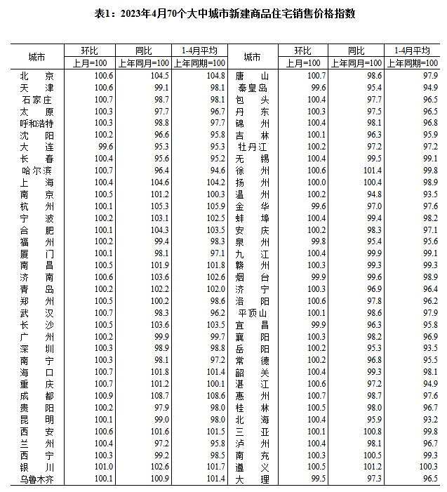 国家统计局网站17日发布2023年4月份70个大中城市商品住宅销售价格变动情况,国家统计局城市司首席统计师绳国庆解读表示,2023年4月份,70个大中城市中商品住宅销售价格环比上涨城市个数减少,同比上涨城市个数增加。70个大中城市商品住宅销售价格环比整体涨幅回落、二手住宅环比涨幅回落更为明显,各线城市商品住宅销售价格同比上涨或降势趋缓。