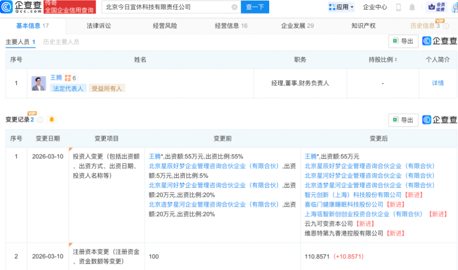 企查查APP显示,近日,小米前高管王腾创立的新公司北京今日宜休科技有限责任公司(简称“今日宜休”)发生工商变更,新增上海瓴智新创创业投资合伙企业(有限合伙)、智元创新(上海)科技股份有限公司、喜临门(603008.SH)、维恩特第九香港控股有限公司、云九可变资本公司等为股东,同时注册资本增至110.86万元,受到市场关注。